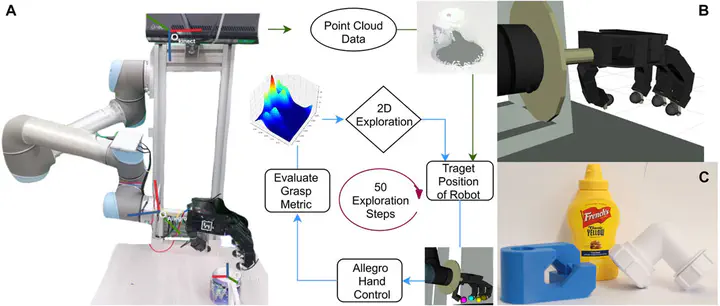 Grasp stability prediction of unknown objects is crucial to enable autonomous robotic manipulation in an unstructured environment. Even if prior information about the object is available, real-time local exploration might be necessary to mitigate object modelling inaccuracies. This paper presents an approach to predict safe grasps of unknown objects using depth vision and a dexterous robot hand equipped with tactile feedback. Our approach does not assume any prior knowledge about the objects. First, an object pose estimation is obtained from RGB-D sensing; then, the object is explored haptically to maximise a given grasp metric. We compare two probabilistic methods (i.e. standard and unscented Bayesian Optimisation) against random exploration (i.e. uniform grid search). Our experimental results demonstrate that these probabilistic methods can provide confident predictions after a limited number of exploratory observations, and that unscented Bayesian Optimisation can find safer grasps, taking into account the uncertainty in robot sensing and grasp execution.